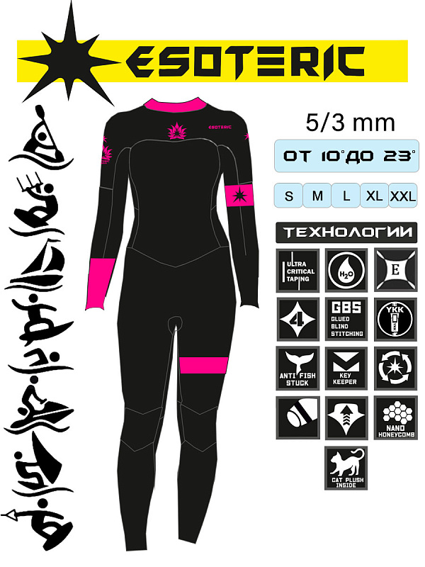 Esoteric Lotus 5/3 — женский гидрокостюм, созданный с учётом анатомии женского тела. Он сочетает тепло, гибкость и выразительный дизайн Black/Pink, подчёркивая стиль и индивидуальность на воде.