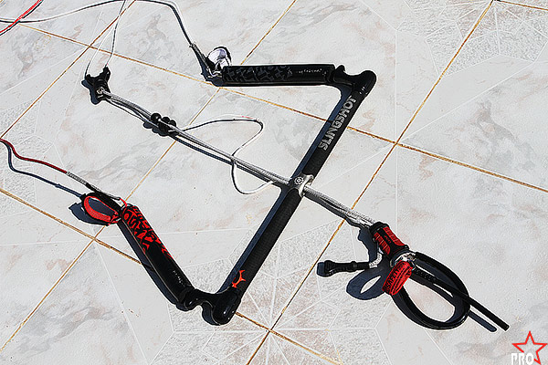 Новая четырех стропная планка, хорошо лежит в руке надежное сцепление, тример под планкой в основании чикенлупа, если вы никогда не пользовались потребует привыкнуть настраивать кайт. А вот при прыжках в анхукед когда необходимо ограничить тягу кайта затягивая тример, свободная часть веревки с утяжелением на конце раскачиваясь может приносить заметное неудобство угрожая получить чувствительный удар по лицу.
