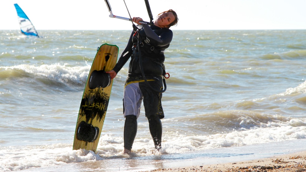 Активно размахавшись кайтом я встала на хороший курс, быстро набирая ходов. Кайт вел себя очень отзывчиво на планке, и достаточно вертко для 12м размера. Поелозив туда-сюда мне вдруг очень захотелось попрыгать, но в порыве безудержной радости от первой водной каталки в этом сезоне я совсем забыла что доска у меня не простая, а не больше – не меньше 156 см…..Опустим подробности размазывания моего лица об воду на хороших ходах, и перейдем к водному рестарту.