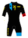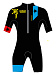 - Яркий дизайн — черный костюм с красными, голубыми и желтыми вставками.