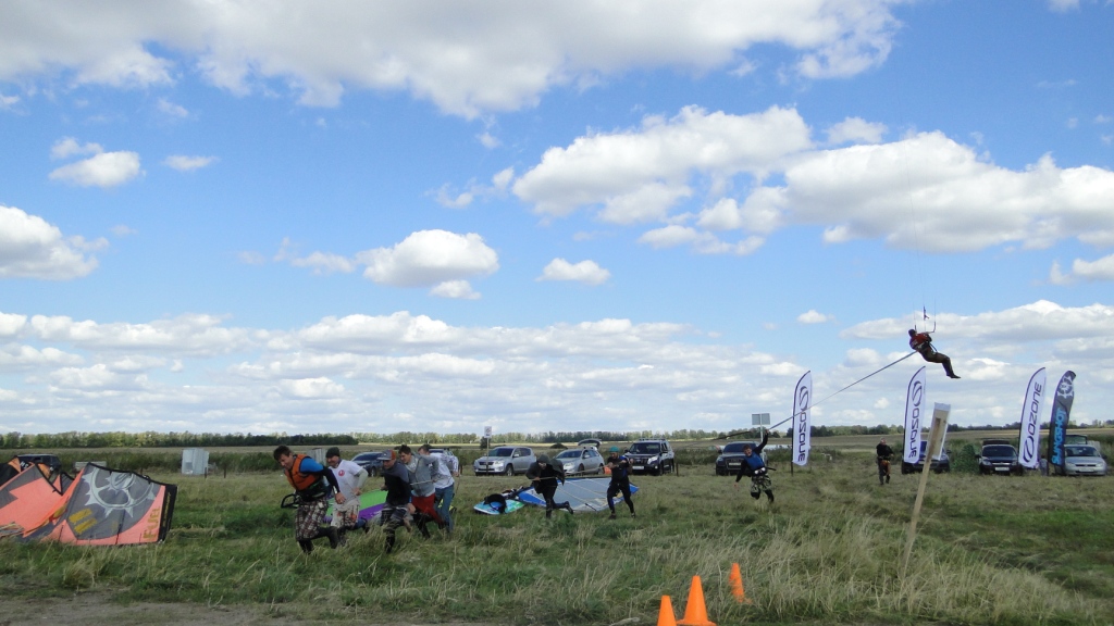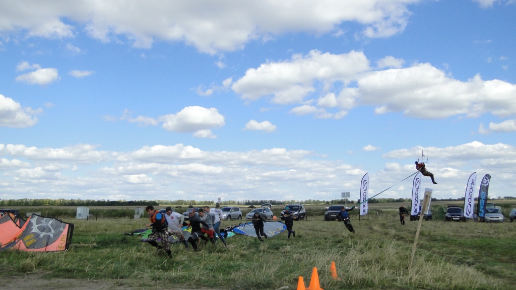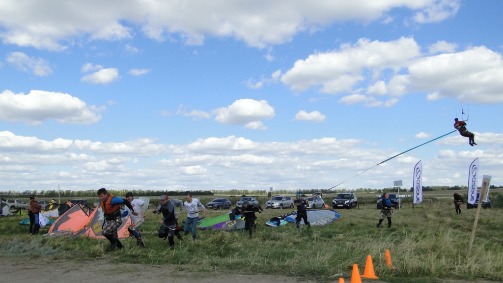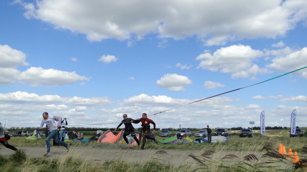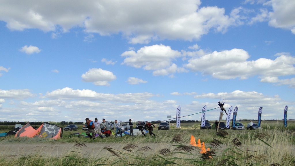 У нашего Димы пред стартом лопнула стропа на подкуполке 14м кайта, и ему пришлось ехать на 9ке