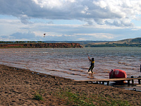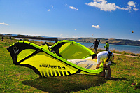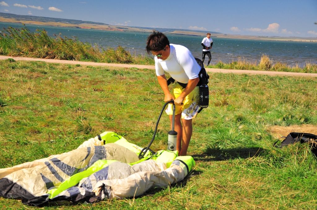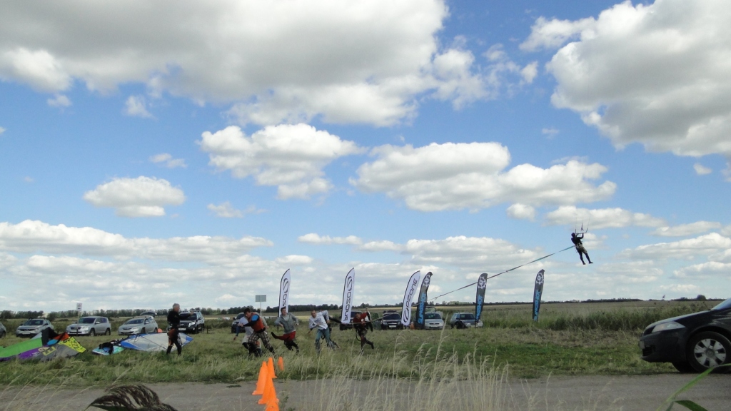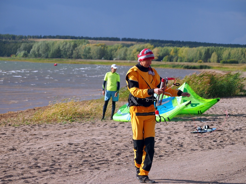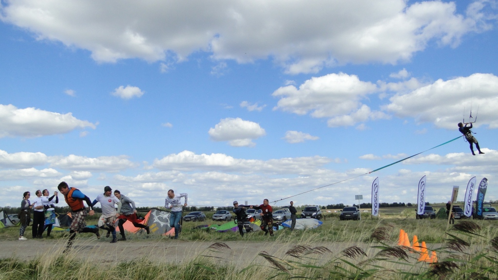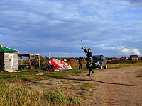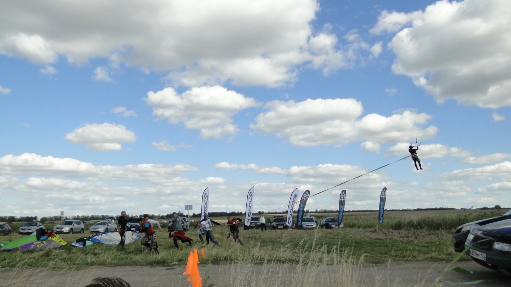 У нашего Димы пред стартом лопнула стропа на подкуполке 14м кайта, и ему пришлось ехать на 9ке