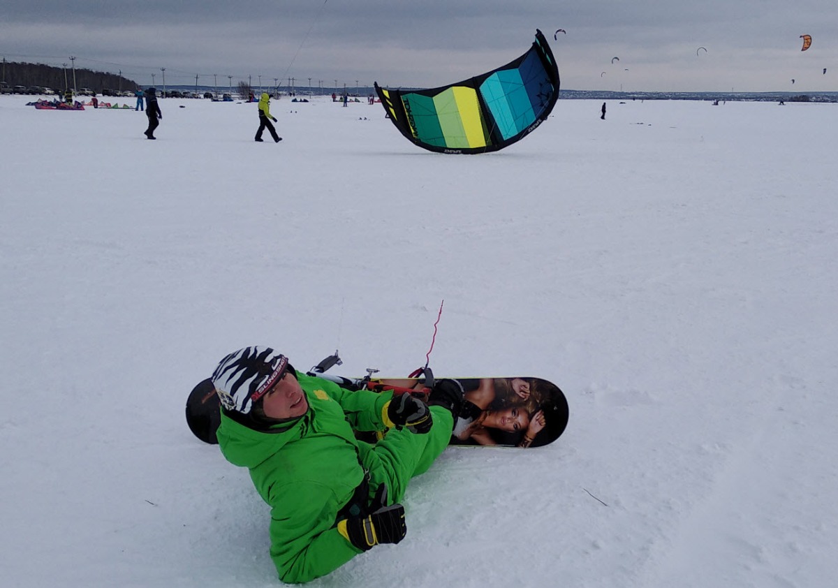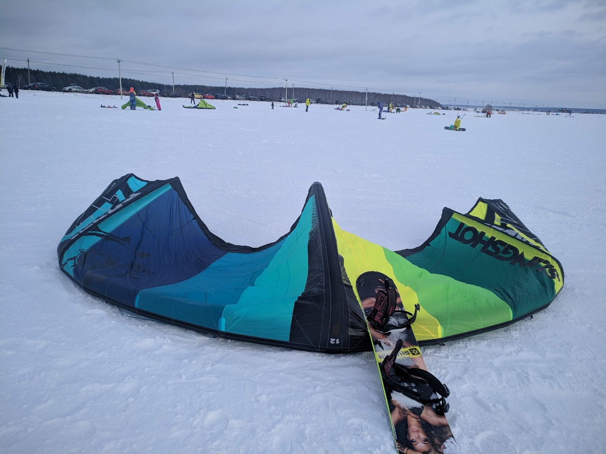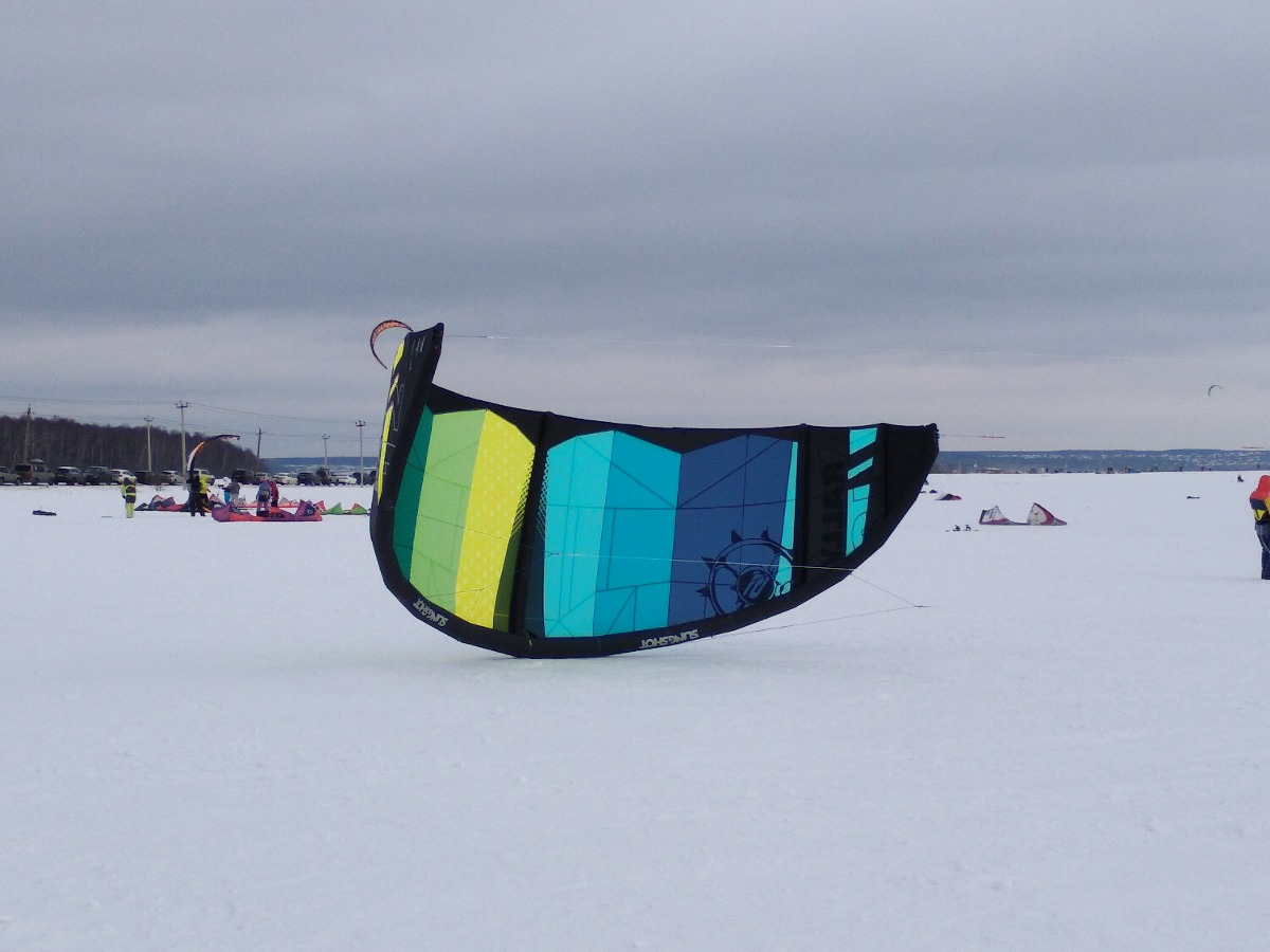 Все надулся, можно катать! Без проблем произвел самостоятельный старт. И хочу отметить один момент, на сноуборде я катался первый раз в жизни))) Всю жизнь катался на лыжах, а тут решил освоить новый для себя снаряд. Условия конечно не лучшее были для этого, ветер рваный, порывистый 7-15 м/с, явный передоз для меня, но затянув триммер вполне получалось с ним справляться. Иногда приходили очень сильные порывы, тогда мне приходилось пережидать их заводя кайт в зенит. И тут я отметил невероятную стабильность кайта, кайт на порывах, находясь в зените залетал далеко за мою голову, но при этом не сваливался, а возвращался обратно в контролируемую зону! Такого я еще не встречал ни на одном кайте! Купол идеально держал форму при любых порывах, ткань не морщилась и была всегда равномерно натянута по всей площади. Ощущение что кайт сделан не из мягкой ткани, а из пластика) Управление простое и понятное, эффективный сброс тяги, простые контролируемые прыжки с переводом кайта. Идеальный кайт для фрирайда. На небольших склонах я разгонялся и переводил кайт в дрифт и можно было свободно скользить, так что для серфа тоже не должно возникнуть никаких проблем.