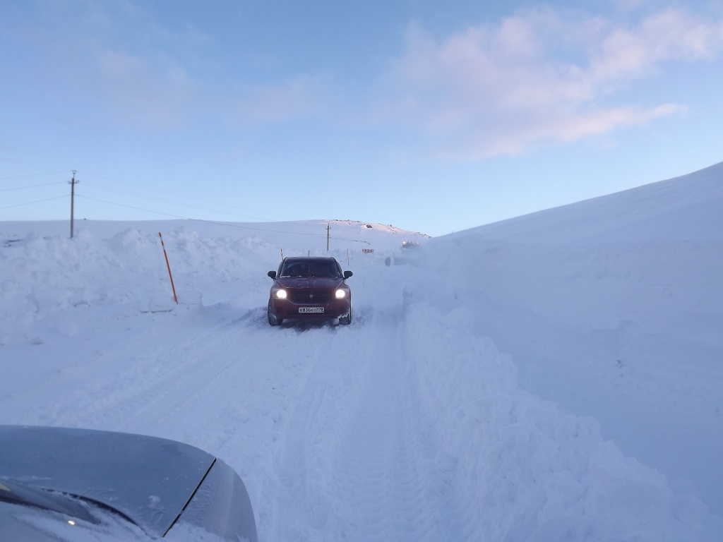 В предпоследний день нам не повезло с погодой – был день <<летающих собак>>, сильный ветер, пурга и снежные заряды с видимостью не более 20 метров…Думали не выберемся, но узнали, что с утра идет ШНЕК (РОТОР), который чистит дорогу…